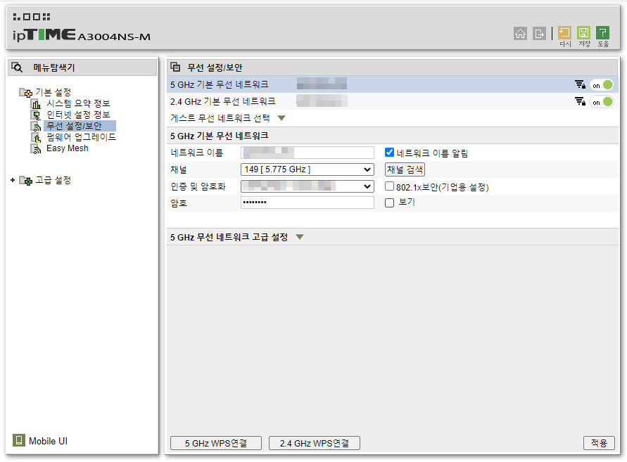 - [고급 설정] → [무선 설정/보안]에서 2.4 GHz, 5 GHz 대역 각각의 SSID·암호를 세부적으로 설정합니다.