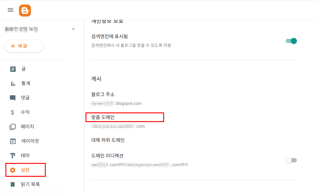 - 블로그스팟 관리자 페이지 → 설정 → 도메인 리디렉션을 켭니다.