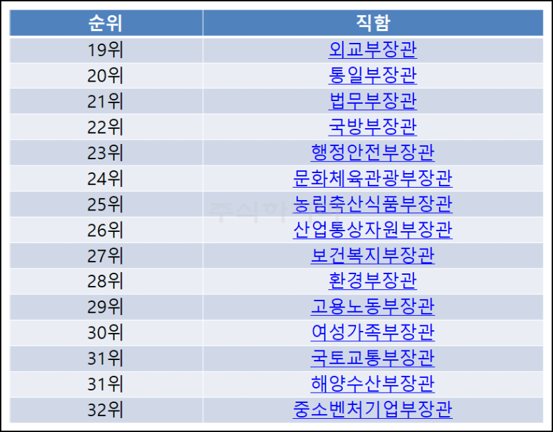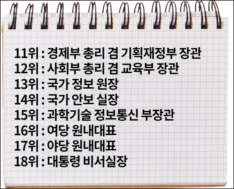 - 차관급 독립기관장(예: 고위공직자범죄수사처장)은 장·차관 사이에 위치합니다.