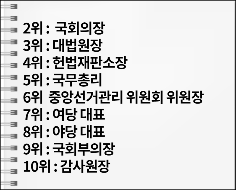 - 국무총리가 ‘내각 1순위’지만 헌법기관장 중에서는 5위입니다.