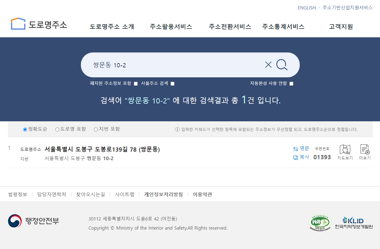 행정안전부 주소정보누리집(도로명주소 안내시스템) 활용