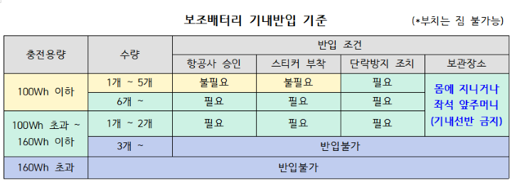 - 기내 충전 금지 등 세부 지침은 항공사 고지 따르기.