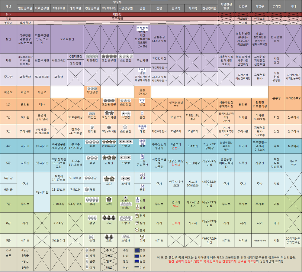 • 검사: ‘검사장·부장검사’ 등은 직위 성격이 강합니다. 일률적인 ‘급수’ 대조는 곤란합니다.
