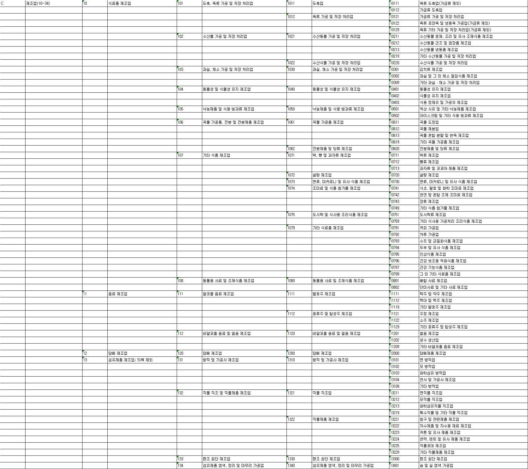 - 대분류: 제조업, 서비스업, 도소매업 등과 같이 큰 범주로 나뉩니다.