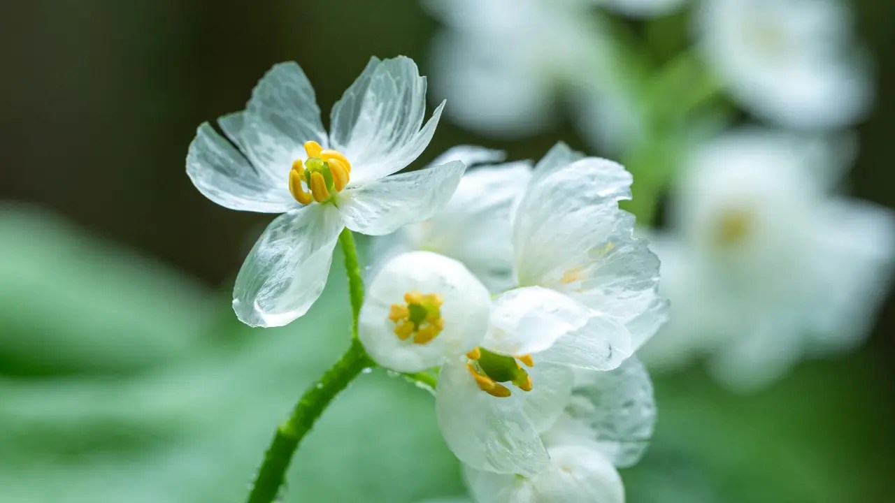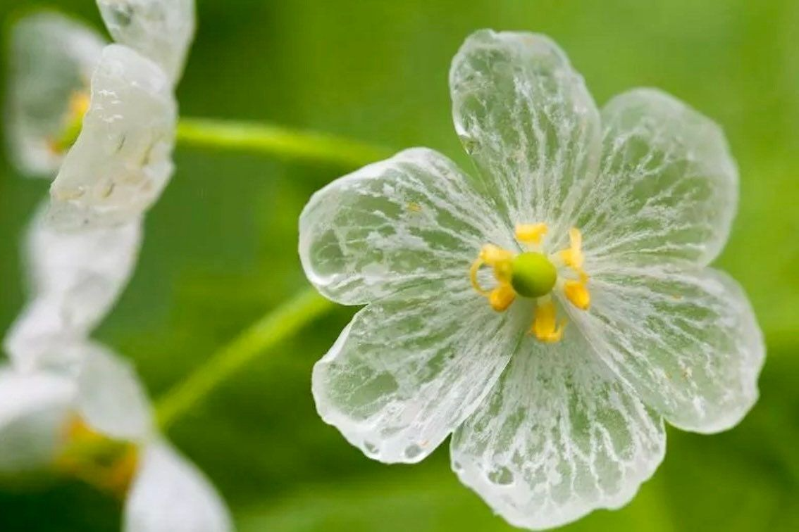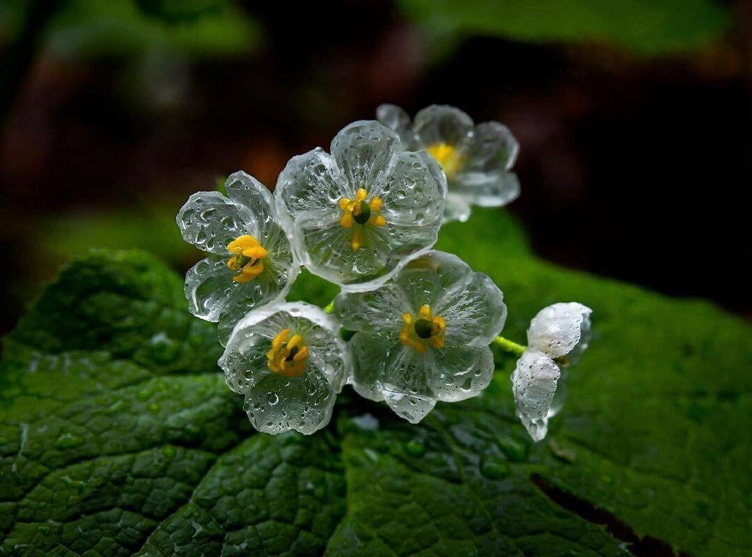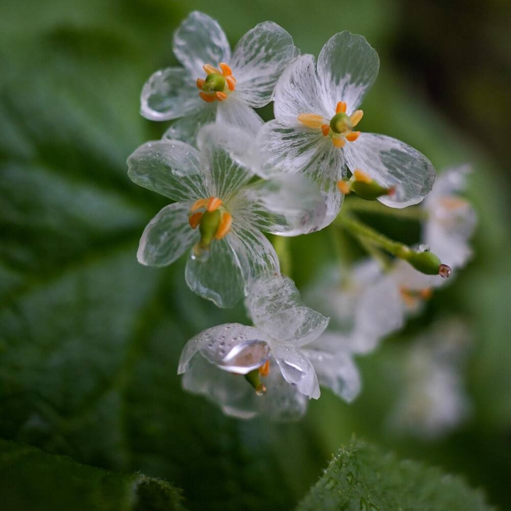 흰 꽃으로 피었다가 비에 젖으면 투명해지는 산하엽(Skeleton Flower)은 그 자체로 자연의 신비를 보여주는 식물입니다. 이 꽃의 학명은 Diphylleia grayi이며, 미나리재비과에 속하는 여러해살이풀입니다. 주로 고산지대에서 자생하며, 일본, 중국, 미국 애팔래치아 산맥 등지에서 발견됩니다. 이 꽃은 투명해지는 독특한 특성 때문에 자연 애호가와 사진작가들에게 큰 사랑을 받고 있습니다.