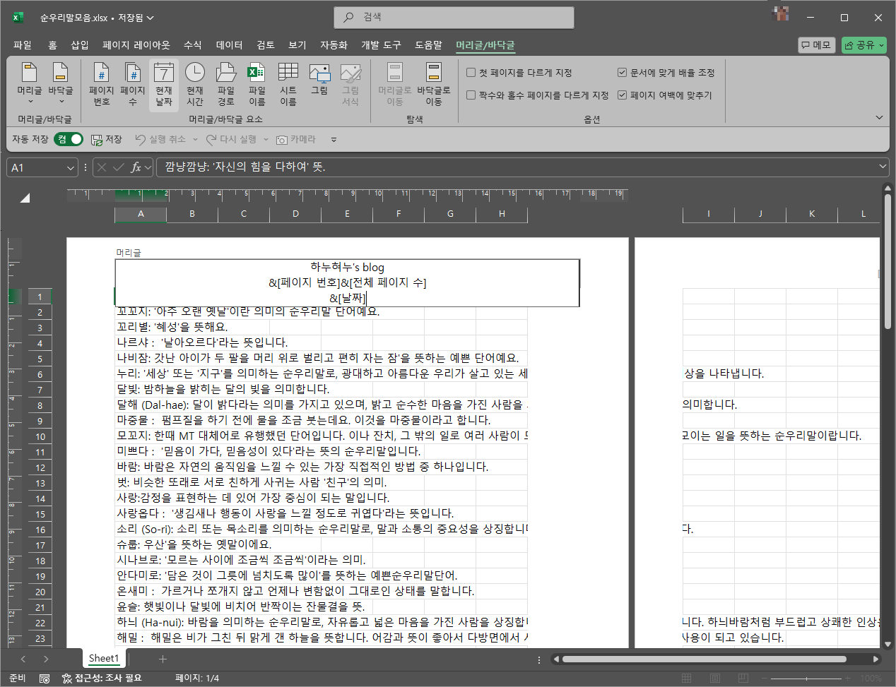주의사항: 머리글/바닥글은 인쇄할 때만 보이며, 일반 편집 화면에서는 표시되지 않습니다. 반드시 [파일 → 인쇄 미리보기] 또는 Ctrl + P를 눌러 확인하세요.