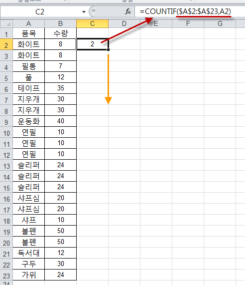 =COUNTIF(A:A, A2) // A열 전체에서 A2 값과 동일한 셀 개수를 계산