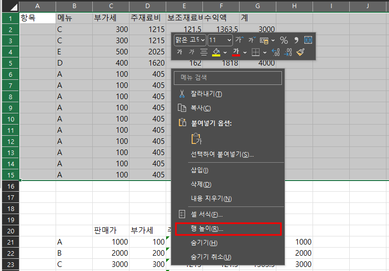 선택한 영역 위에서 마우스 오른쪽 버튼을 클릭하고, 팝업 메뉴에서 ‘행 높이’를 선택합니다. - 원하는 높이 입력