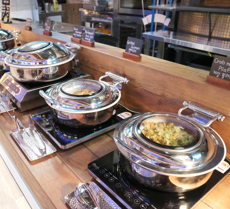한식 코너에는 한국 전통 반찬들이 제공되어 한식을 먹을 수 있는 옵션도 제공됩니다. 또한, 스프, 탕, 볶음면, 그릴야채, 소시지, 베이컨, 스크램블에그, 서니사이드업, 감자튀김, 모둠치즈 2종 등 다양한 메뉴가 제공되어 다양한 맛과 조합으로 식사를 즐길 수 있습니다.
