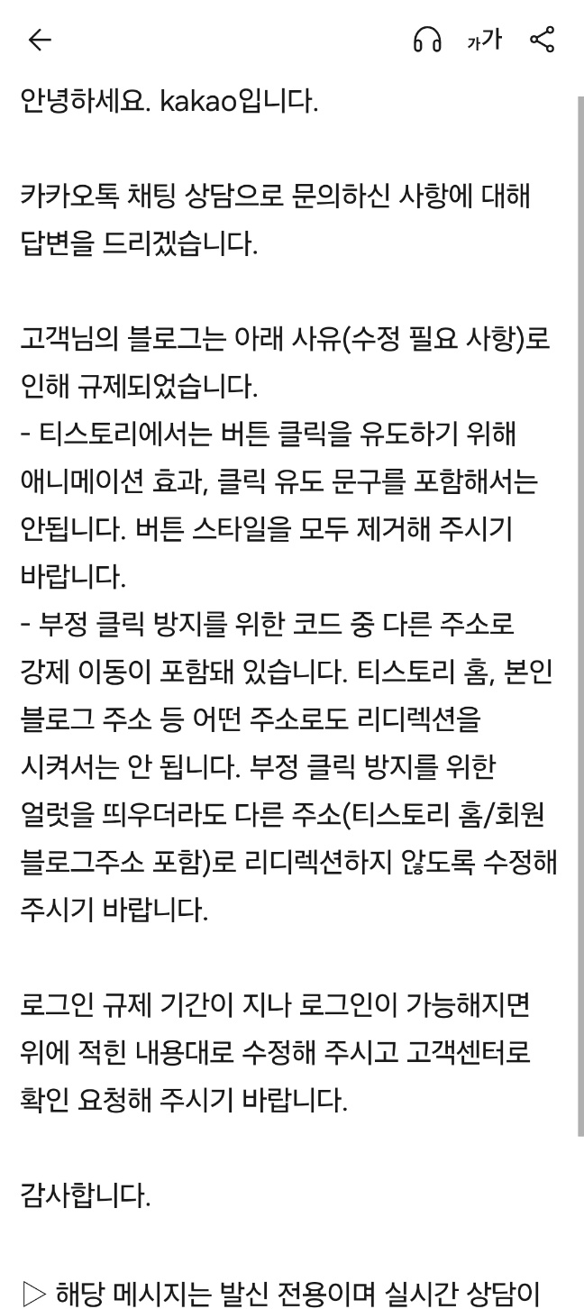 최근 카카오 고객센터로부터 “버튼 클릭 유도 애니메이션·리디렉션 코드가 포함돼 있다”는 사유로 30일 로그인 제한을 받은 실제 사례를 바탕으로, 정책 위반 요소를 점검하고 안전하게 무효 트래픽을 방지하는 방법을 정리했습니다.