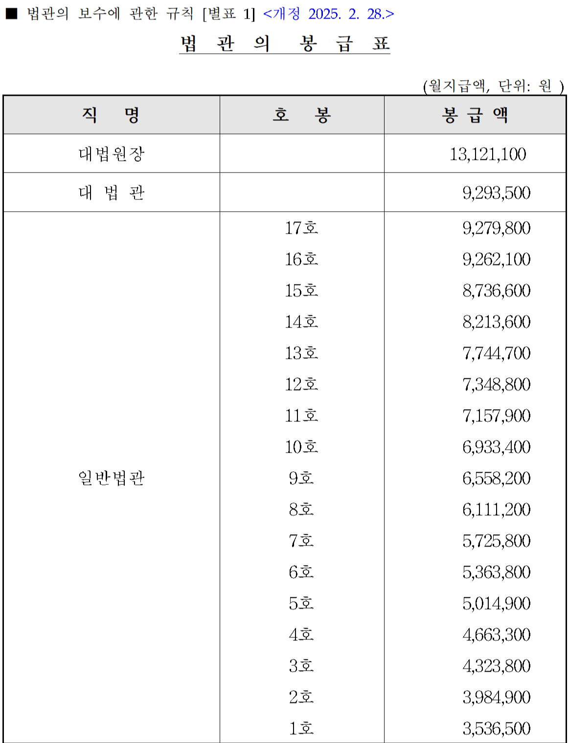 법관의 계급체계는 대법원장–대법관–일반법관의 세 단계로 구분되지만, 실제 봉급표에서 금액 차이는 대법원장·대법관 vs. 일반법관(1~17호)으로 갈립니다. 2025년 기준: