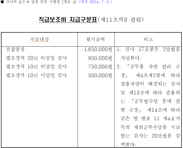 - 직무성과급: 전년 검사 9호봉 월급(6,367,200 원) 수준을 기준액으로 부여