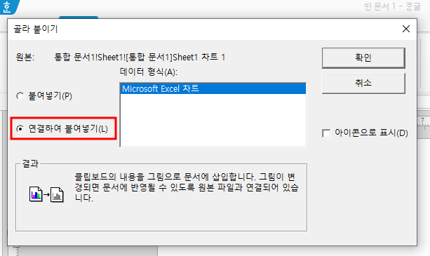 [연결하여 붙이기]를 선택합니다. - 한글 문서에 붙여진 차트는 엑셀 원본 파일과 링크되어 있어, 엑셀 파일에서 차트를 수정하면 한글 문서의 차트도 자동으로 업데이트됩니다.