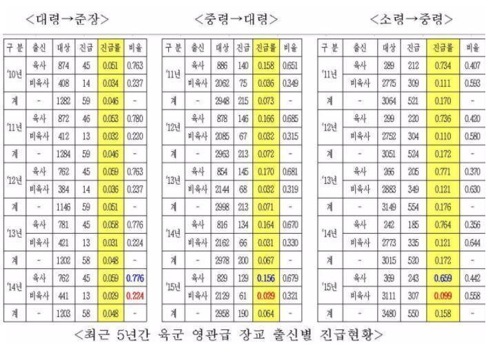 - 대령: 전투병과 5.2:1, 기술·행정 3.8:1