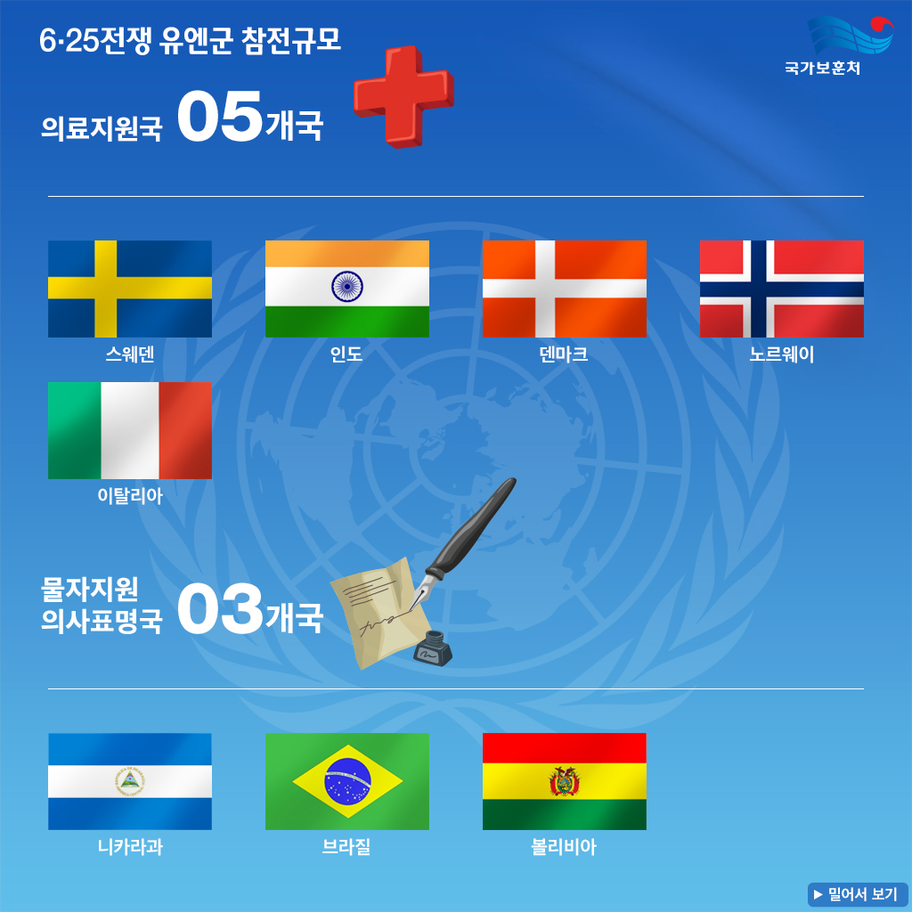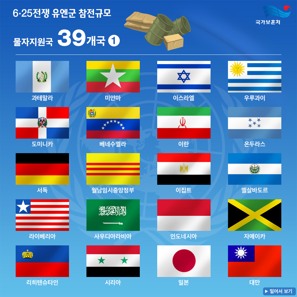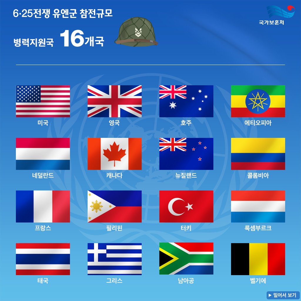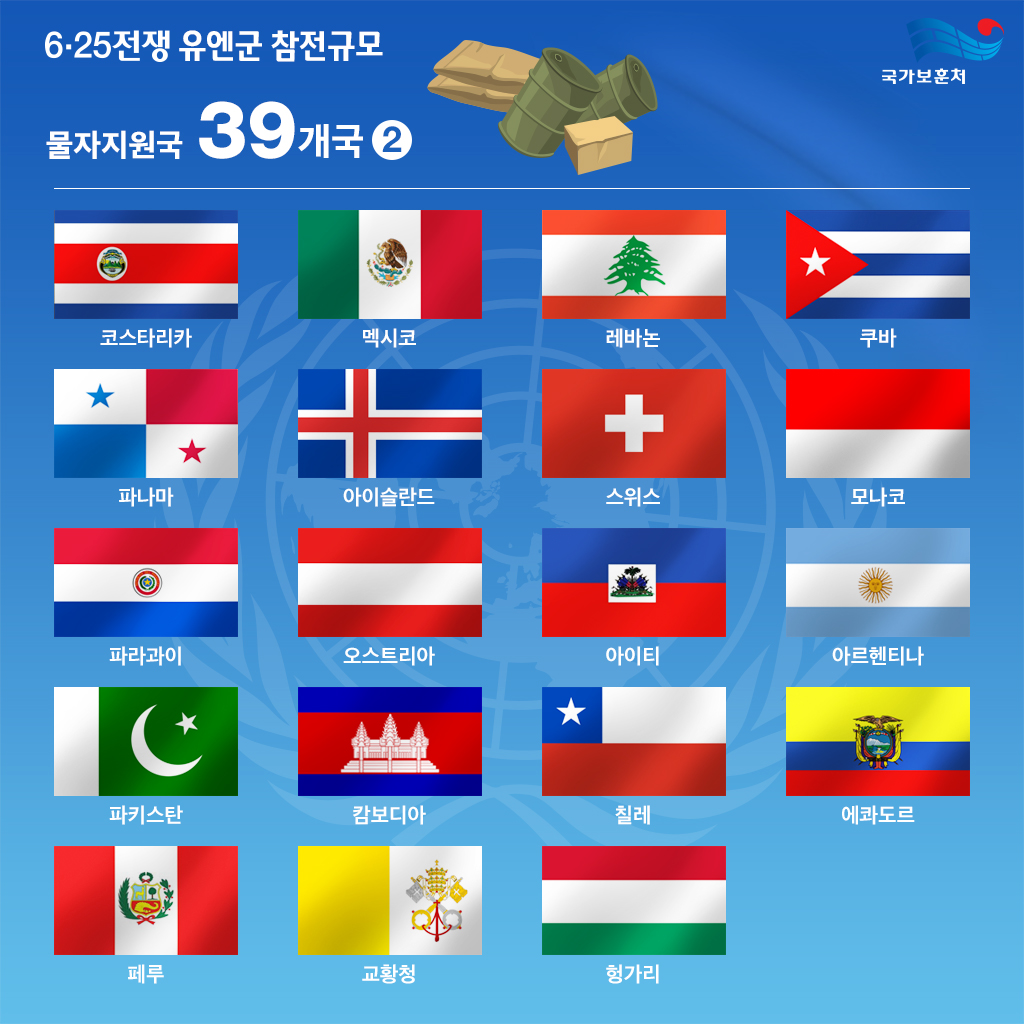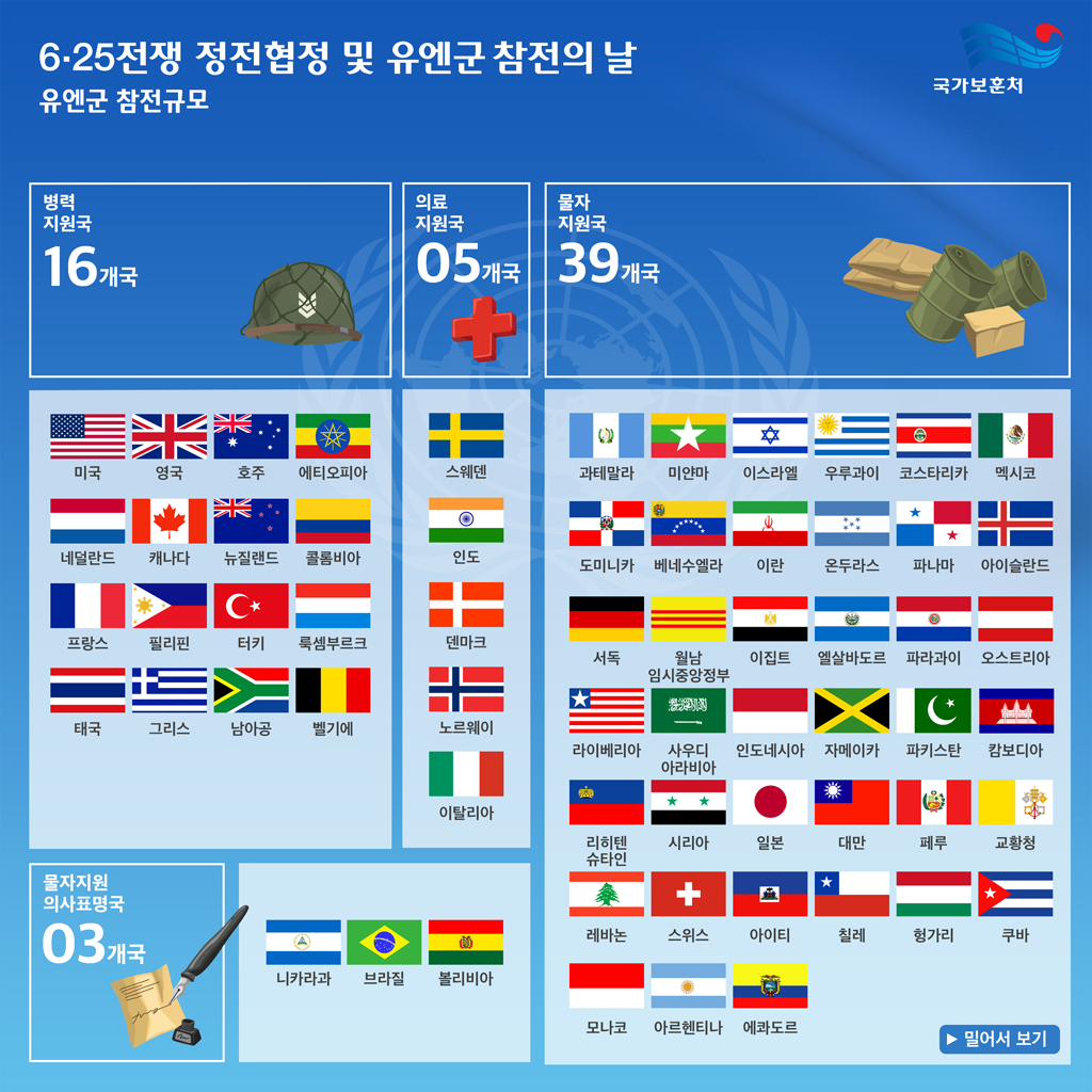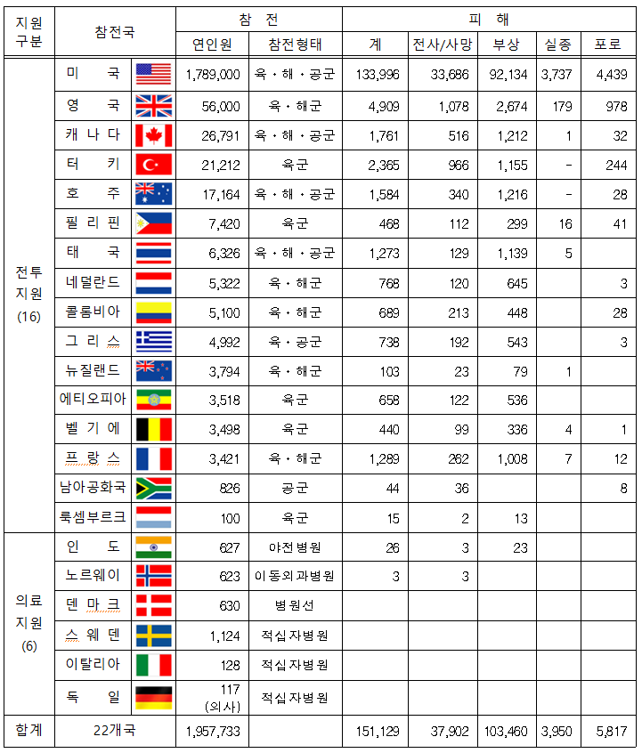 6.25 전쟁이 지나고 시간이 흐르면서 전쟁의 의미와 기여에 대한 평가 기준도 변화하였습니다. 초기 전투참가국 외에도, 전쟁 후반기 및 전후 복구 과정에서 직접 전투는 아니었지만 각종 지원과 후원, 인도적 구호 활동 등 여러 분야에서 기여한 국가들이 새롭게 포함되기 시작했습니다. 이 과정에서 국제 사회는 전쟁의 다양한 측면에서 도움을 준 국가들을 포괄적으로 인정하며, 그 수를 22개국으로 확장하게 되었습니다.